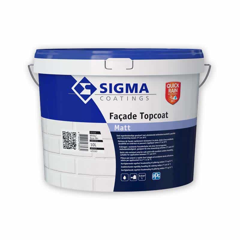 Sigma Facade Topcoat Matt QRR is een gevelverf die binnen 20 minuten regenbestendig is. Sigma Facade Topcoat Matt QRR is een matte, bijzonder veelzijdige buitengevelverf op waterbasis. Het is een gevelverf voor het afwerken van beton, metselwerk, pleisterwerk en cementgebonden plaatmateriaal. Daarnaast kan je Sigma Facade Topcoat Matt QRR ook gebruiken voor het overschilderen van bestaande, intacte muurverflagen op basis van kunstharsdispersie. Sigma Facade Topcoat Matt QRR gevelverf staat bekend om zijn uitstekende buitenduurzaamheid en snelle regenbestendigheid (na 20 minuten bij 23°C). Sigma Facade Topcoat Matt QRR is goed waterdamp doorlatend en carbonatieremmend. Sigma Facade Topcoat Matt QRR zorgt er voor dat er geringe vuilaanhechting zal ontstaan.