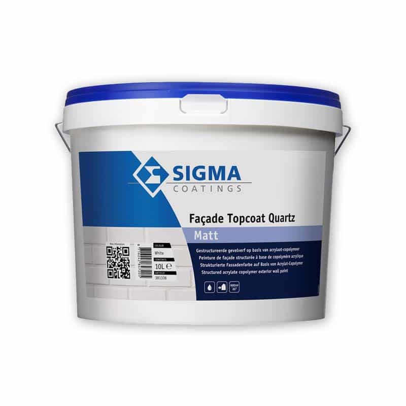 Sigma Facade Topcoat Quartz Matt (voorheen Sigma Kwartstone Matt) is een matte kwartsverf met fijnkorrelige, ronde structuur. Sigma Facade Topcoat Quartz Matt is een matte gevelverf met structuur voor verschillende ondergronden buitenshuis. Je gebruikt Sigma Facade Topcoat Quartz Matt voor het afwerken van beton, cellenbeton, metselwerk (baksteen en kalkzandsteen) en pleiserwerk. Daarnaast kan je de kwartsverf ook inzetten voor het overschilderen van bestaande muurverflagen op basis van kunstharsdispersie.
