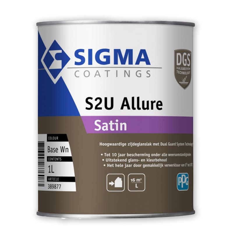 Sigma S2U Allure Satin zorgt ervoor dat je in de juiste omstandigheden tot 10 jaar onderhoudsvrij bent. Dat is nog eens optimaal resultaat en genieten van je schilderwerk! Deze zijdeglans lak van Sigma is van uitmuntende kwaliteit. De Sigma S2U Allure Satin heeft zeer veel voordelen voor de doe-het-zelver. De verf is soepel te verwerken, bestand tegen alle weersinvloeden van buitenaf en kras-en slijtvast. Zorg voor het optimale resultaat en bescherming door deze zijdeglans lak aan te brengen op een juist voorbehandelde ondergrond. (zie ook onze grondverf en primers). Gebruik daarnaast ook de juiste verfmaterialen, zoals (lak)rollers en kwasten.