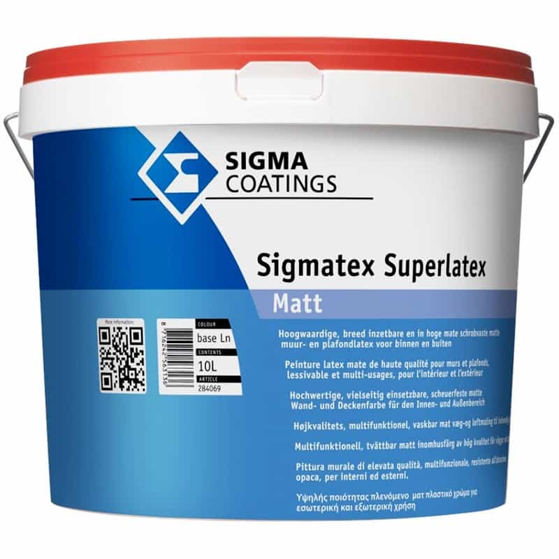 Sigma Sigmatex Superlatex Matt kopen? Het is een muurverf die je zowel binnen als buiten kunt gebruiken. Voor de beschutte delen, om er op een universele manier mee te schilderen. Sigmatex Superlatex Matt is geschikt voor zowel buiten als binnen. Dit komt omdat de verf op basis van een kunstharsdispersie is en niet op waterbasis. Deze verf van professionele kwaliteit is te gebruiken op beton, metselwerk, pleisterwerk, gipsplaten en glasweefsel.