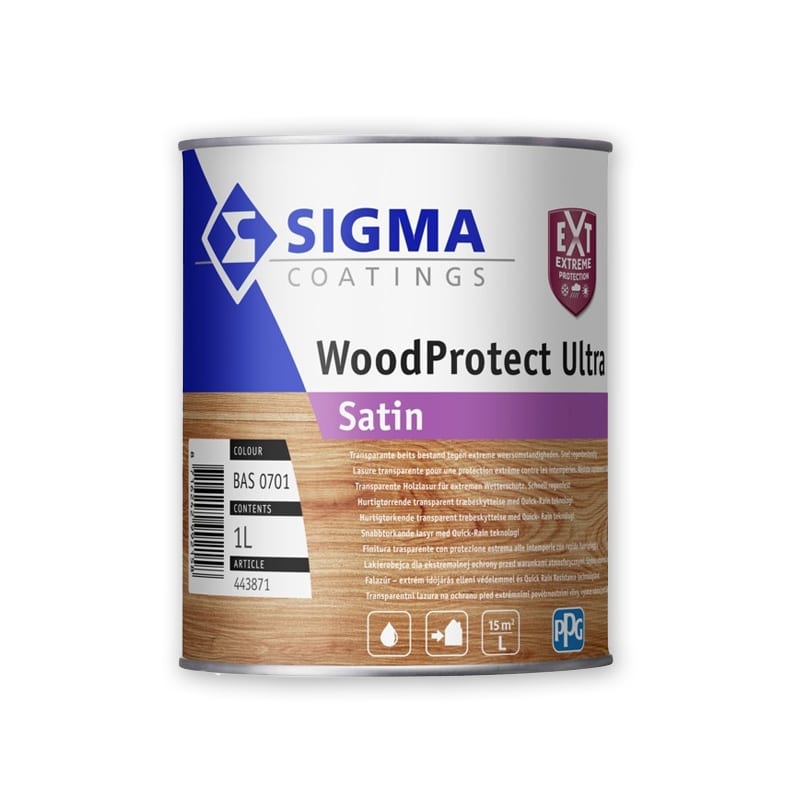 Sigma WoodProtect Ultra is watergedragen, snel regenbestendige, transparante beits voor buiten en binnen. Deze beits is ideaal voor het transparant afwerken van klimaatscheidende elementen, zoals kozijnen, ramen en deuren. De impregneerbeits is verkrijgbaar in diverse houtkleuren en diverse decoratieve kleuren.