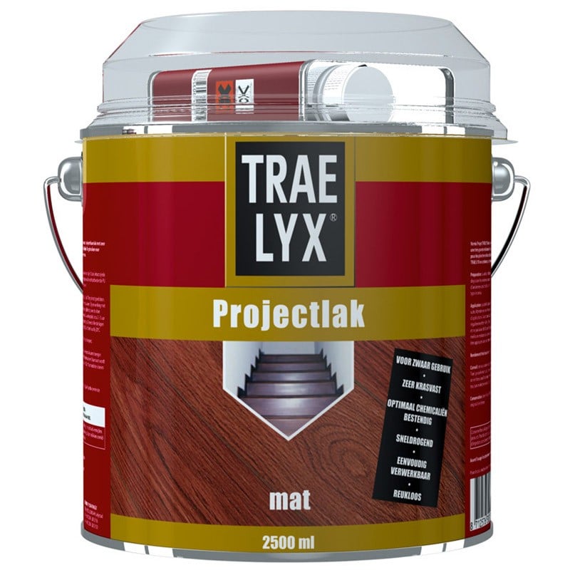 Trae Lyx Projectlak is een waterverdunbare 2 componentenlak op polyurethaan basis. Verkrijgbaar in hoogglans, zijdeglans, mat. Trae Lyx Projectlak heeft een zeer hoge kras- en slijtvastheid. Dit maakt de projectlak geschikt voor de afwerking van houten vloeren en trappen, die intensief belast worden.  bestandheid tegen huidvet en chemicaliën. Daarnaast geeft de projectielak de vloer een uitstraling van een olievloer maar met het gemak van een lakvloer.